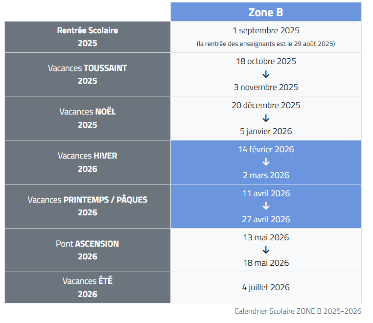 Le départ en vacances a lieu après la classe, la reprise des cours le matin des jours indiqués.